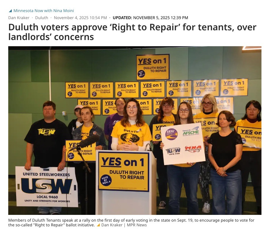 By a 69 to 31 percent margin, Duluth voters have approved a groundbreaking ballot measure called “Right to Repair” which will enable tenants to carry out simple repairs and deduct the cost from their monthly rent, rather than wait for landlords to follow through.